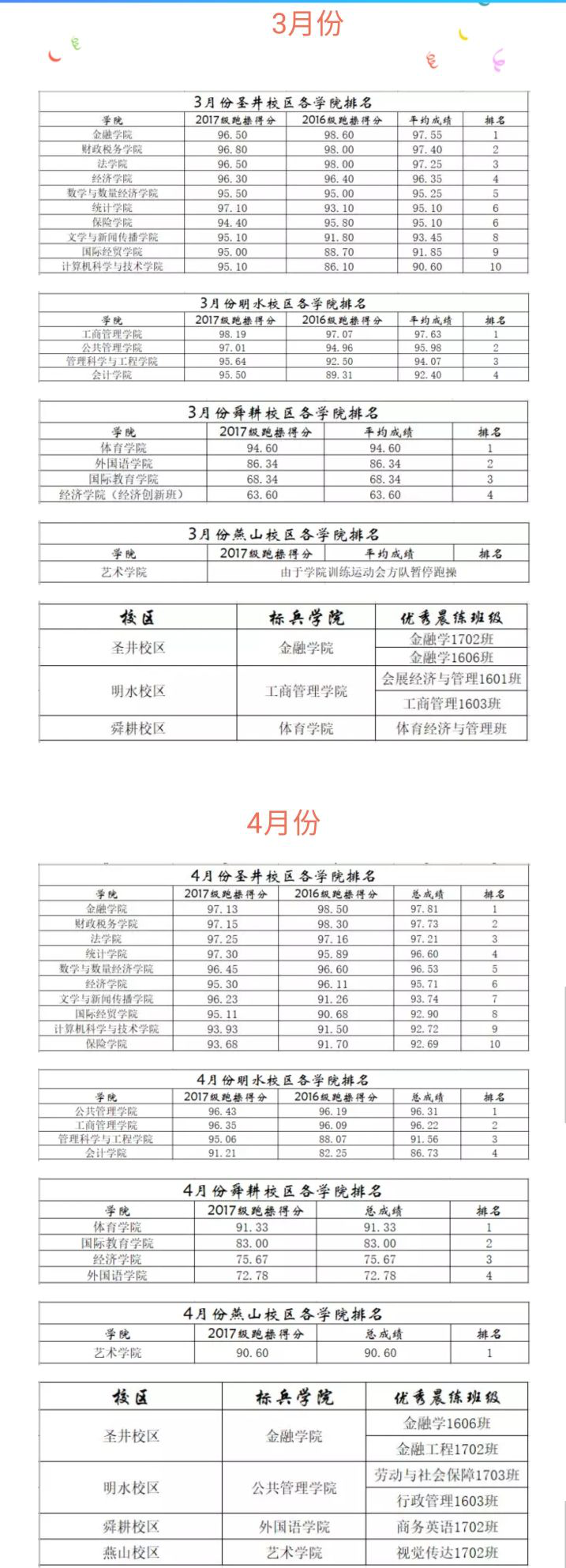 我院本学期晨练活动在3、4月份的考核中,2016级、2017级的总体成绩均居圣井校区各学院排名榜首,并且我院被评为标兵学院,我院金融学1702班和1606班被评为标兵班级。我院晨练活动取得的优异成绩中包含着院学生会统筹工作的付出和努力,各班级的协调配合,更有学生代表、学生干部发挥的模范带头作用。正是有了上下团结一致的目标和完善的管理工作,我院的阳光晨练工作才能得到良好的开展,并在各学院的评比中成为本学期的跑操标兵学院。